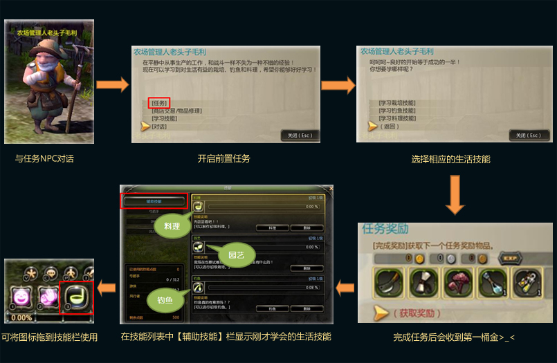 3.钓鱼、园艺技能必须在规定的区域中才可以使用,料理技能不受此限制。