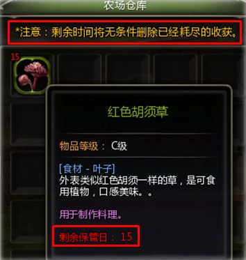 | 7.收割的农作物将自动存放于农场仓库中,且有一定的保管时间。若玩家超过了保管期限仍没有从仓库中取出收割的作物,系统将自动清空; |